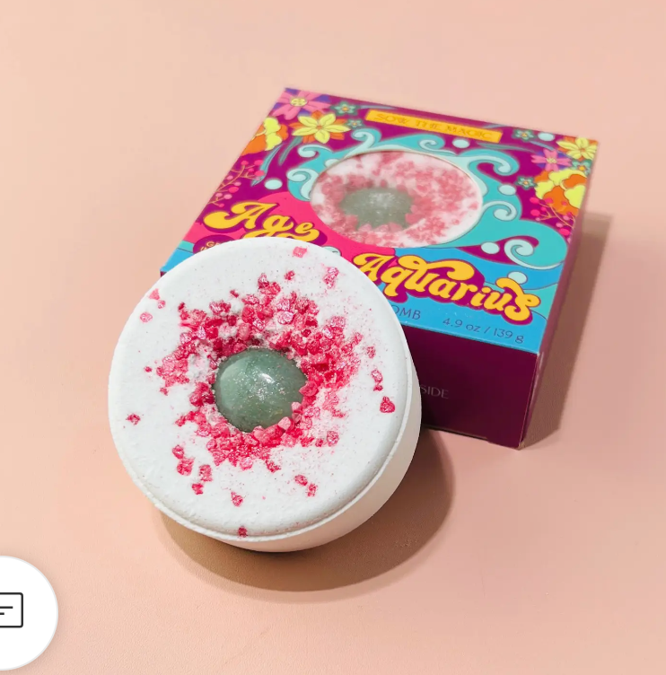 As the Moon aligns with Earth and Sun we enter into a new era of peace and harmony. This is the Age of Aquarius! Shift your energy to a state of relaxation with this lemongrass scented bath bomb that transforms your bath into a space where new beginnings and dreams become reality. A natural Aventurine stone is included in each bomb to protect positive energy and promote spiritual healing. Directions: Open the package and place bath bomb under running water. Steep in bath for as long as desired. Aventurine gemstone inside.